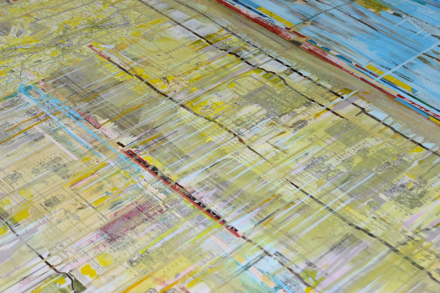 Train timetables, engineer and conductor safety manuals, and maps, for example, all uniquely capture the routines and rhythms of train travel. I try to capture that sense of adventure by deconstructing these materials and transforming them into vibrant, abstract tapestries.